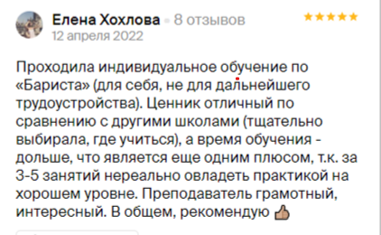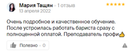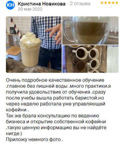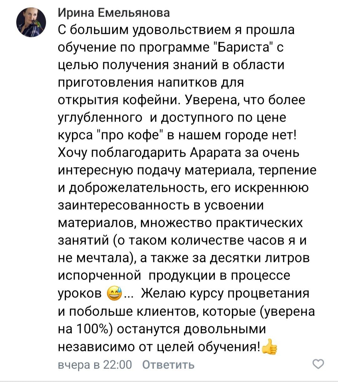 После курса вы будете: ✔ Знать все правила и тонкости приготовления кофе ✔ Отличать между собой сорта и подбирать нужный вам ✔ Проводить каппинг кофе ✔ Готовить более 30 разновидностей кофейных напитков ✔ Знать альтернативные методы приготовления кофе ✔ Контролировать все этапы приготовления кофе и при необходимости редактировать их ✔ Рисовать латте-арт ✔ Владеть техниками продажи кофе ✔ Разовьете личностные и профессиональные качества, нужные для работы с посетителями кофейни ✔ Иметь полный набор знаний о том, как функционирует кофейня |